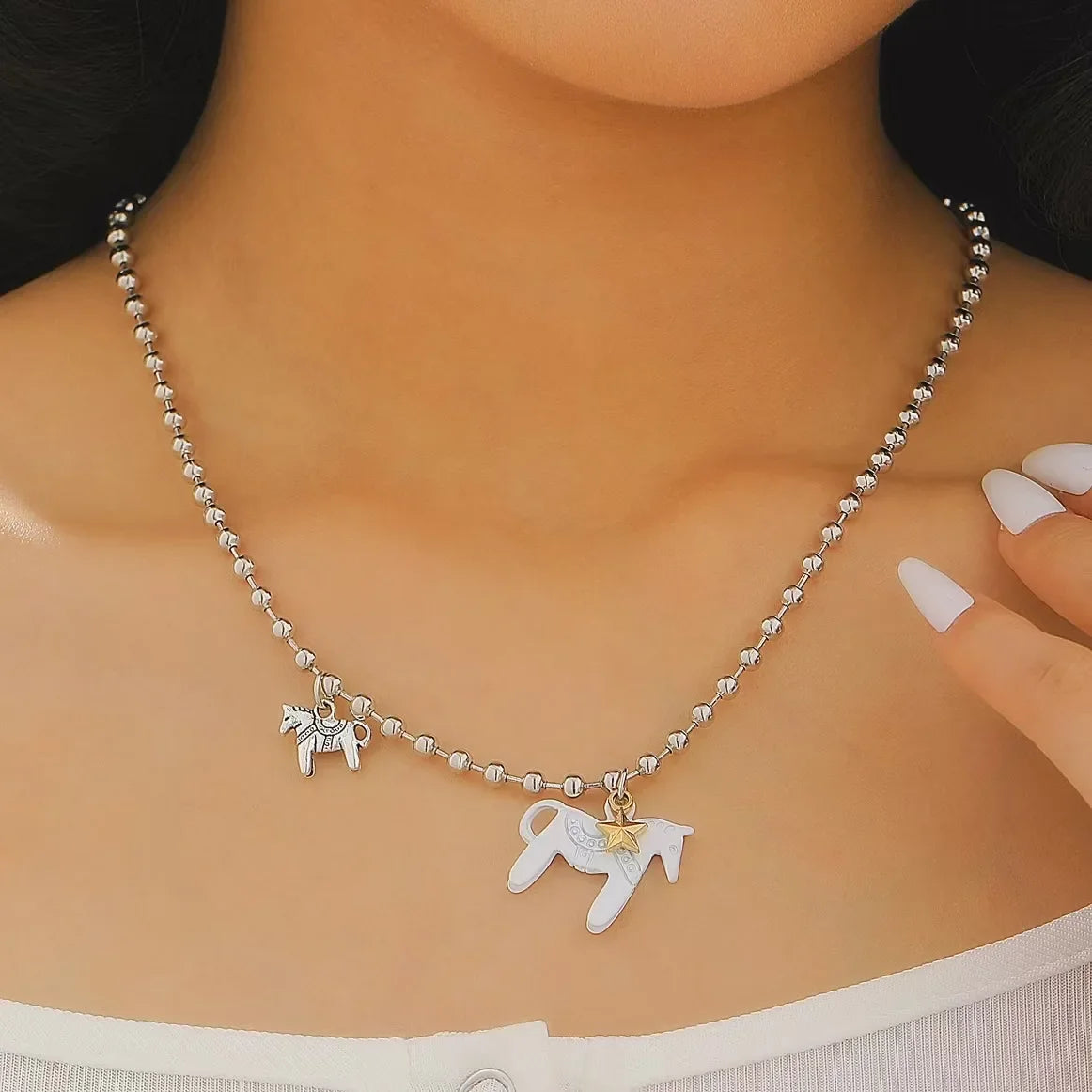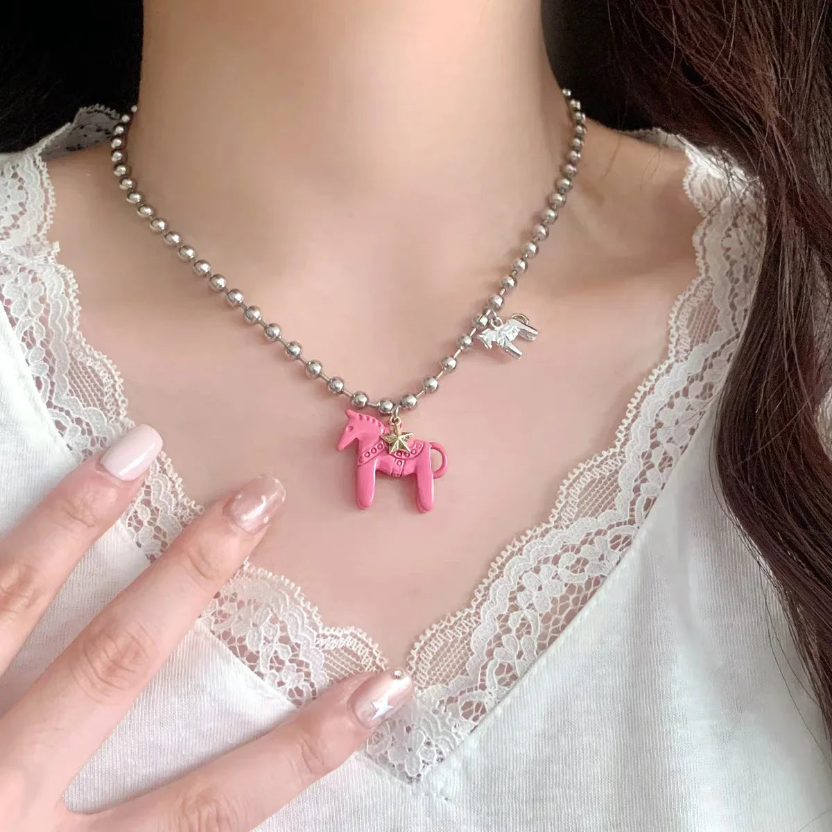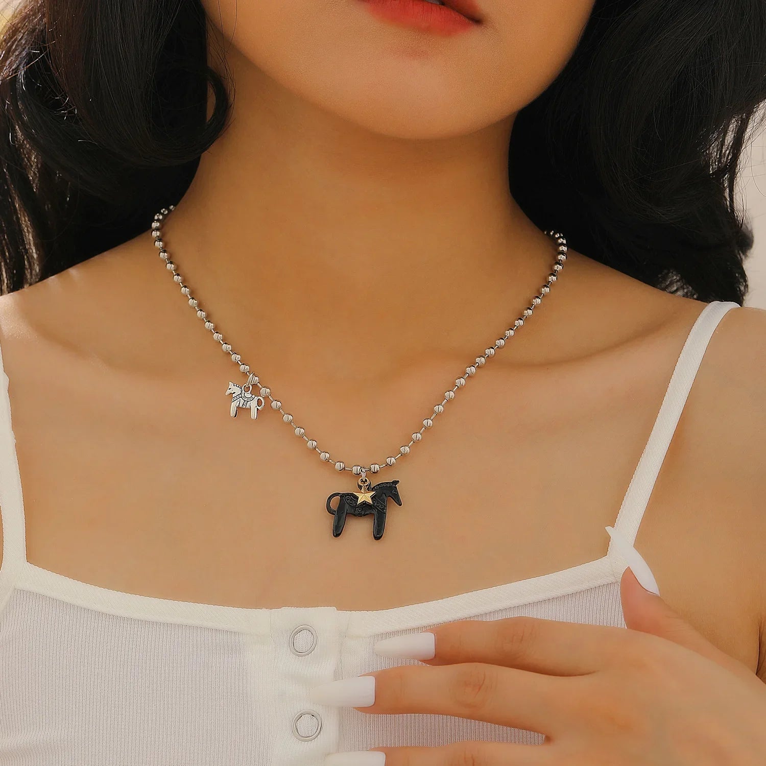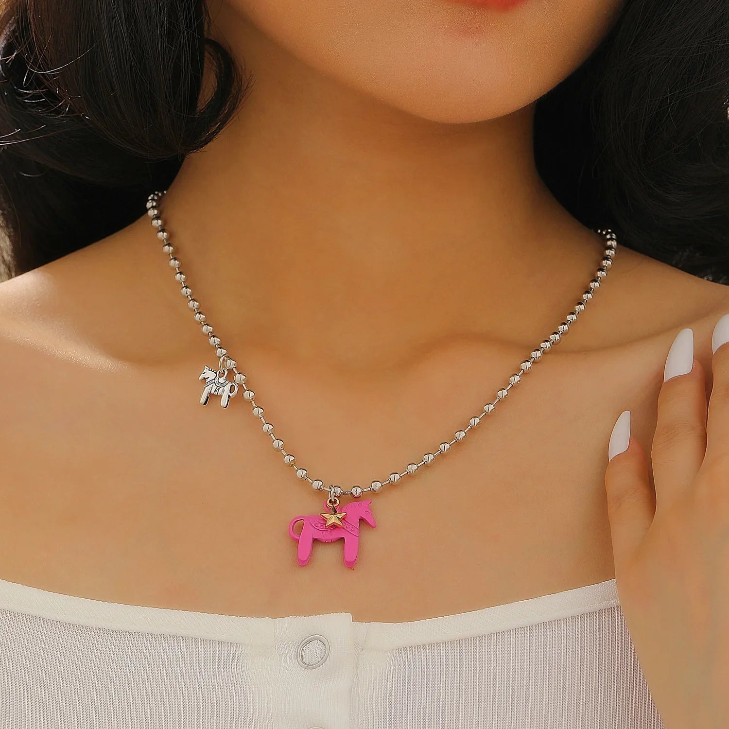 Collar con colgante de caballo de esmalte LATS, divertido y lindo, color blanco, negro y rosa, para mujer, con cuentas de aleación, cadena, gargantilla, joyería de moda.