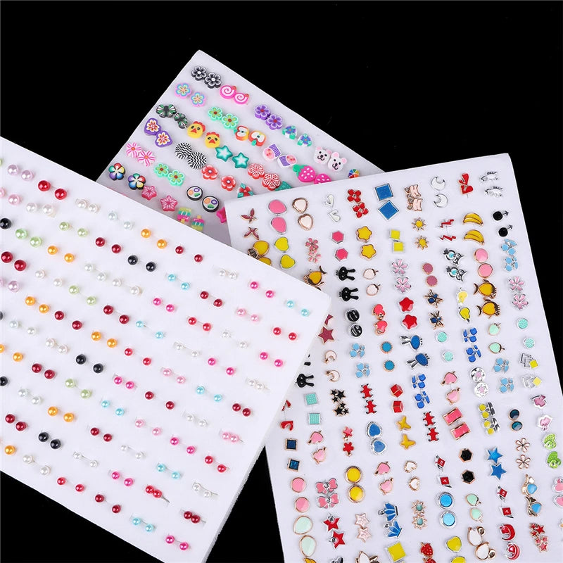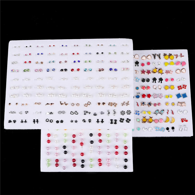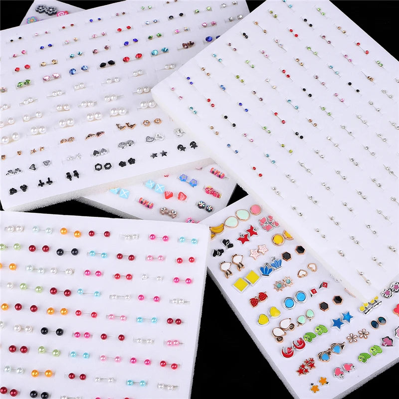 This stunning set features 100 pairs of small stud earrings crafted from lightweight plastic and accented with acrylic crystals, perfect for everyday wear or special occasions. Designed with a variety of trendy shapes including hearts, stars, moons, animals, and flowers, these earrings offer versatile style options suitable for women and girls alike.