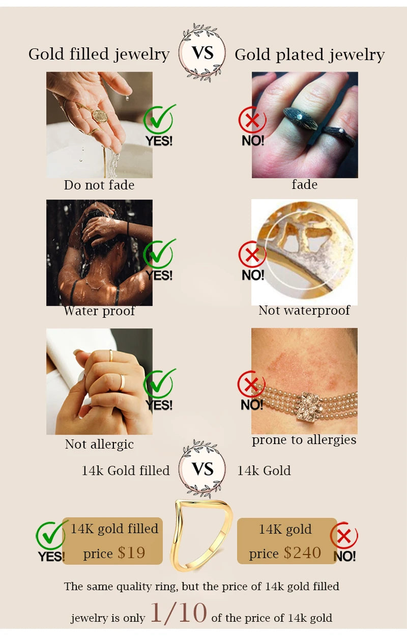 Compared to standard gold plated rings, these gold filled zircon rings offer significantly greater longevity and quality. Gold filled jewelry contains 100 times more gold than typical gold plating, making these rings resistant to rubbing off and tarnishing. This makes them ideal as a versatile piece that you can wear to the gym, shower, or sleep in without worry. Additionally, the hypoallergenic properties provide peace of mind for individuals with sensitive skin, setting these pieces apart as fine, enduring jewelry rather than mere fashion accessories.
