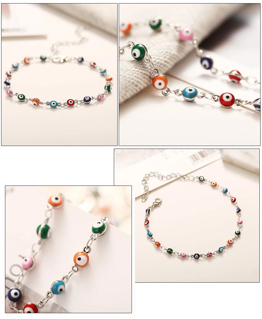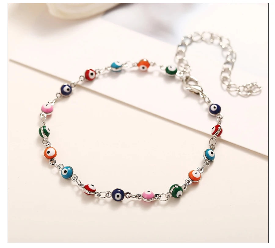 These Fashion Colorful Turkish Eyes Anklets for Women combine bohemian style with charming gold-colored beads and a delicate pendant design, making them perfect barefoot sandals for any occasion. Crafted from durable zinc alloy, these anklets offer a trendy look lasting through summer parties, weddings, and daily wear.