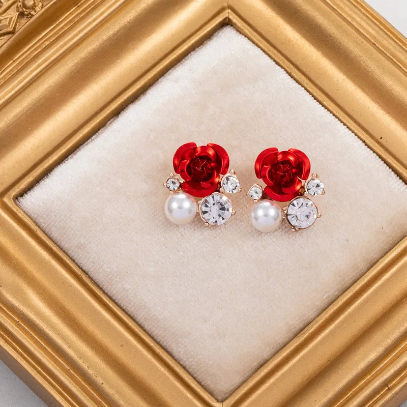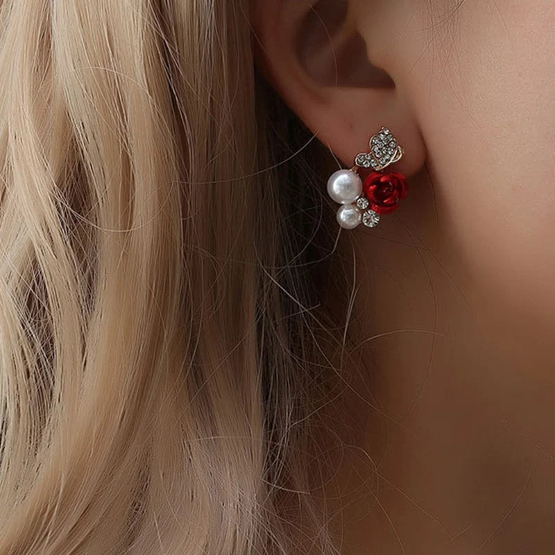 These exquisite fashion stud earrings feature a delicate red rose design adorned with sparkling rhinestones, complemented by charming butterfly and angel wing motifs alongside elegant pearl flowers. Crafted from durable zinc alloy metal, these earrings combine trendy style with everyday wearability for women and girls.