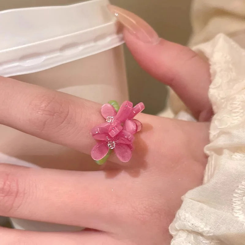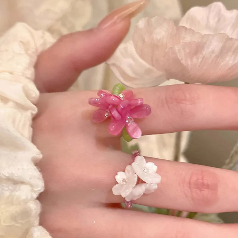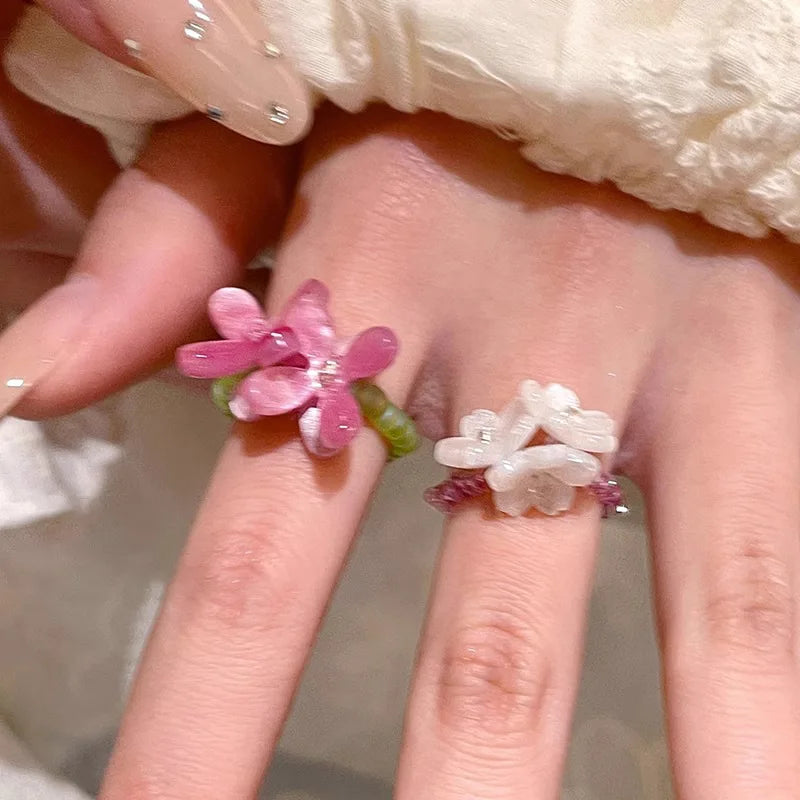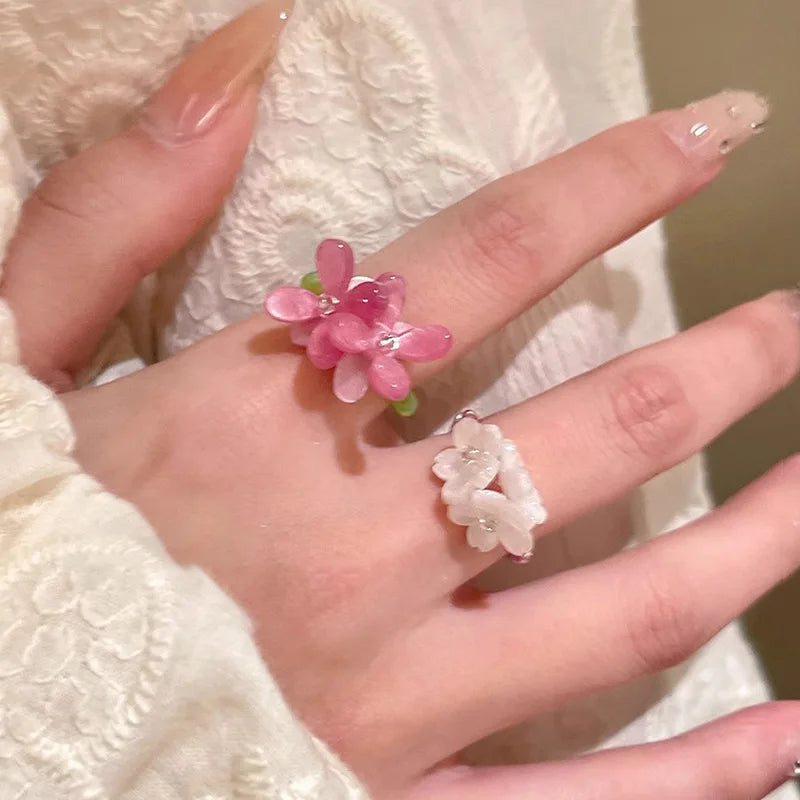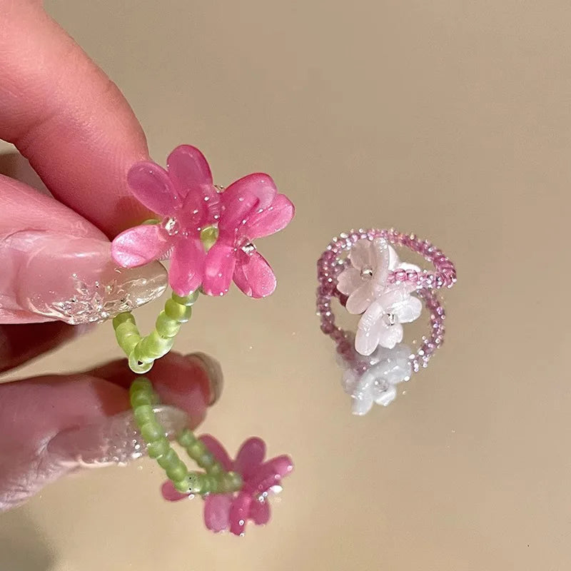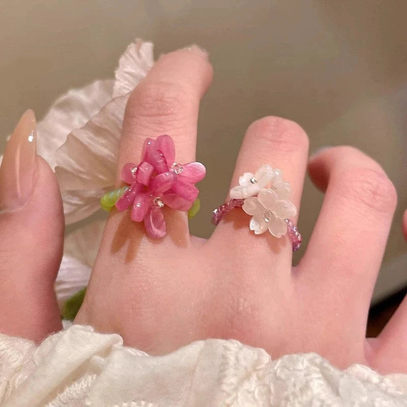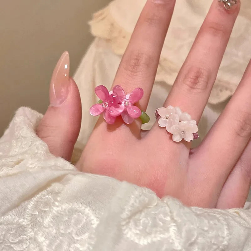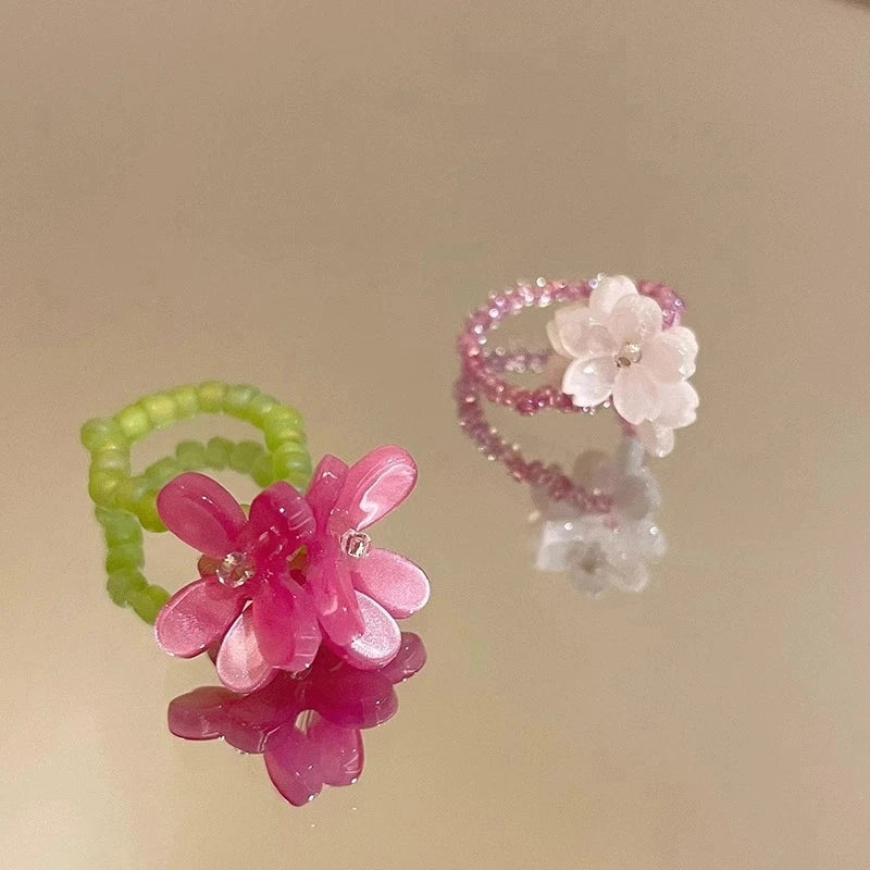 Violet Flower Acrylic Ring New Korean Style White Lily Index Finger Ring Elastic Beaded Unique Creativity Fold Women Jewelry