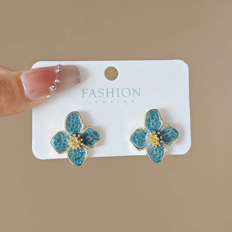Brincos de pino com flor de óleo esmaltada verde claro para mulheres, brincos elegantes com quatro pétalas de flores, joias fofas e modernas para festa, presente