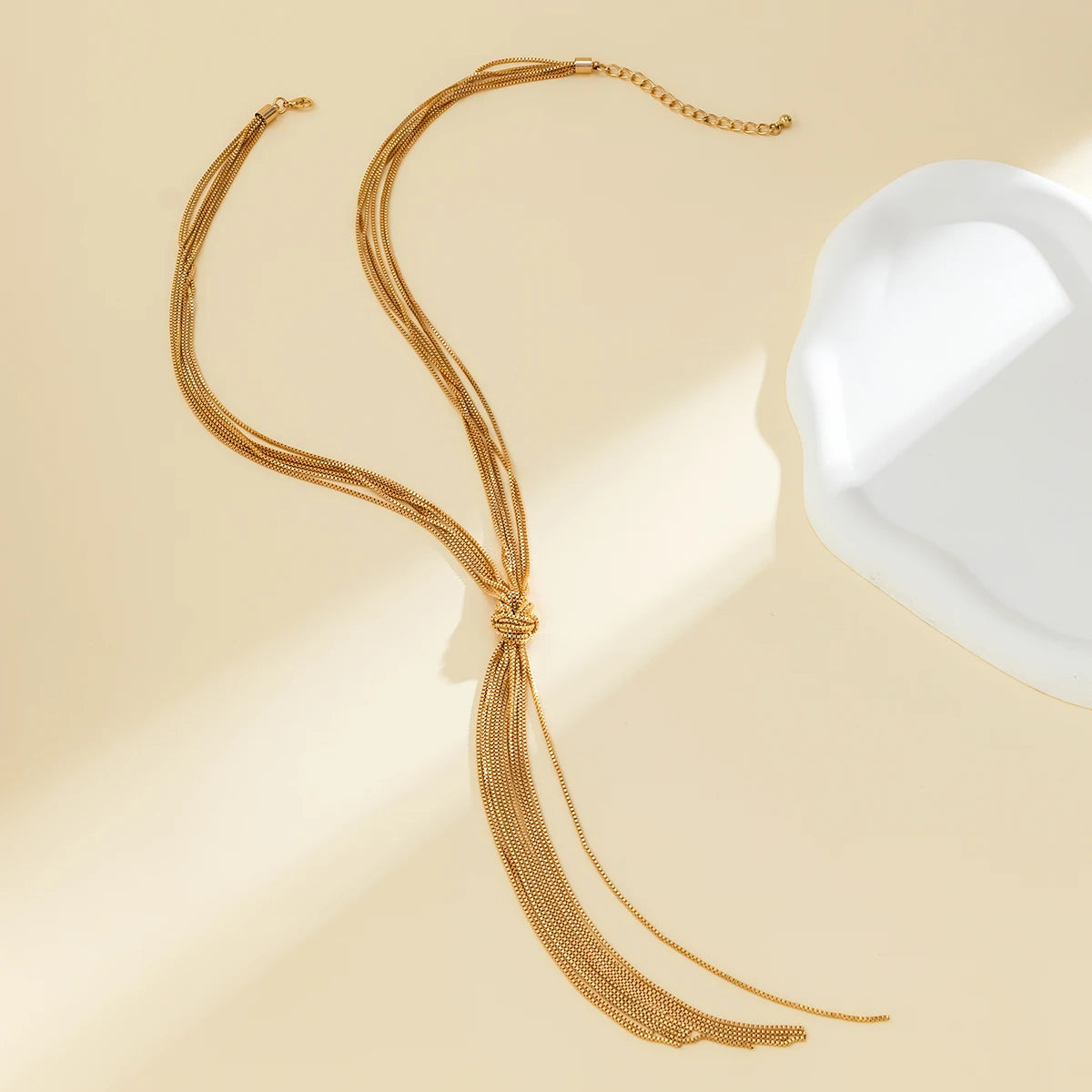 Este colar longo com nó para mulheres é um acessório moderno criado para complementar qualquer roupa, especialmente para casamentos e ocasiões da moda em 2023. Apresentando um design de corrente de caixa durável com borlas charmosas, este colar de metal combina estilo e versatilidade.
