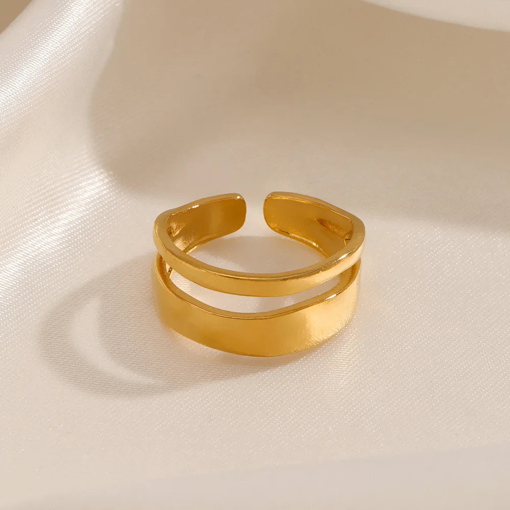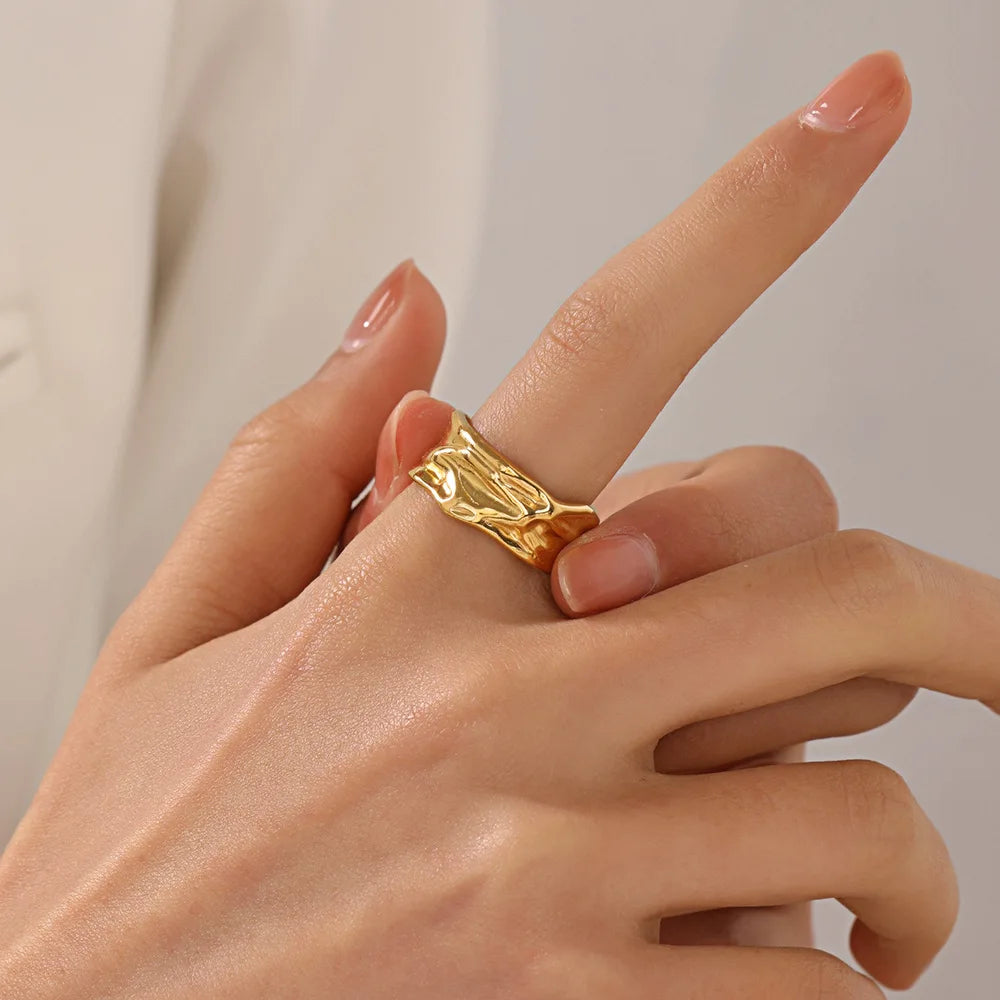 Estes anéis de aço inoxidável apresentam um inovador design geométrico irregular aberto, combinado com uma luxuosa textura dourada, equilibrando perfeitamente a elegância moderna e a praticidade do dia a dia. Fabricados com precisão, estes anéis são duráveis, confortáveis e projetados para combinar com ocasiões casuais e formais sem esforço.